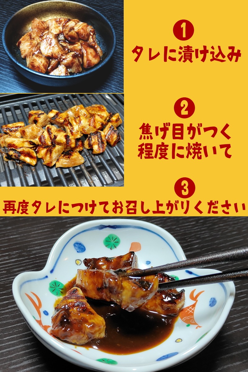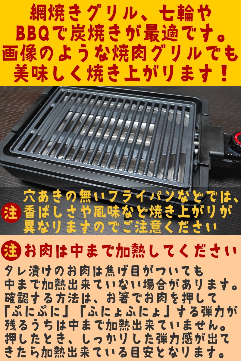 (1)鶏肉を細めのスライス(約2cm角でも可)に切り、本商品と軽く混ぜ合わせます。 (2)「金網」や「穴あきの焼肉プレート」にて程よくコゲがつくまで焼いてください。 (3)火が通ったらつけ皿に入れた本商品に二度づけしてお召し上がりください。 ※鶏肉の大きさはお好みですが、大きすぎると火の通りが遅くなりみそダレの焦げがひどくなります。 ※網ではなく鉄板で焼くと、とり焼肉の香ばしさなど風味が大きく異なりますのでご注意ください。 ※お酒の肴にする場合は、つけ皿のタレにお好み量でニンニクを足してもいいそうです。 |
